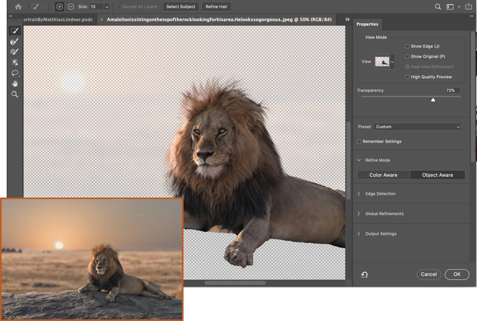 Now, Refine Hair and Object Aware Refine Mode make it criminally simple to pick out what should and shouldn't be included as part of a selection, separating hair and background objects with a click.