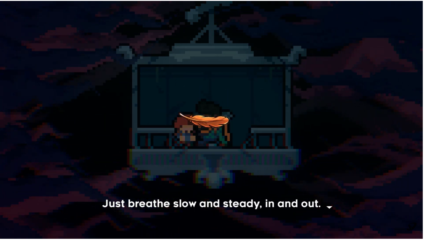 Reminiscent is this line from Celeste, where Theo, a fellow climber wishing to test his mettle, teaches Madeline a technique to regulate her anxiety while they’re trapped inside a malfunctioning gondola.