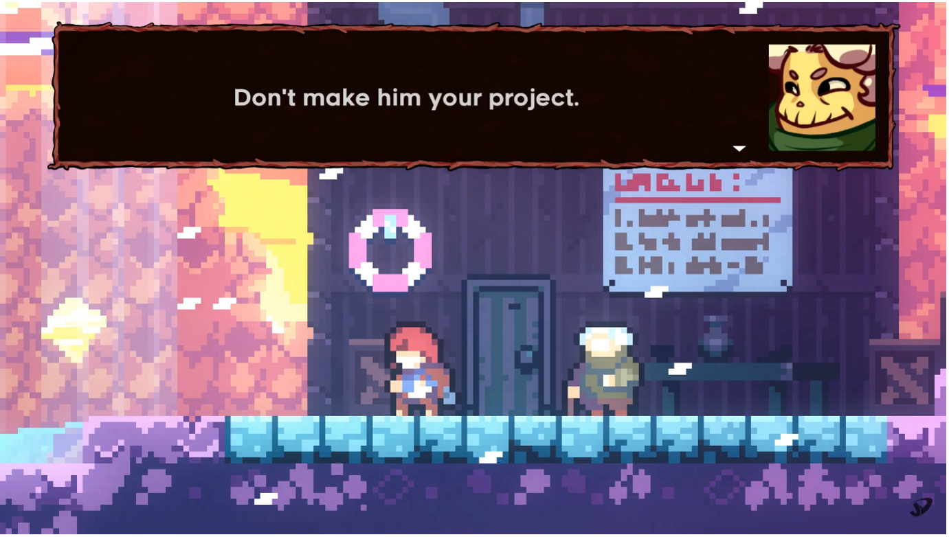 Upon starting her journey Madeline meets Granny, an old woman who lives on Celeste Mountain and knows of all its secrets. However, when Granny warns Madeline of the challenging plight ahead of her, she is quick to reply with a scathing remark and a quick deflection.