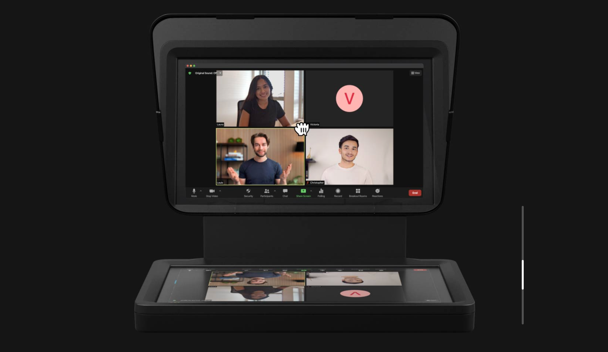 One of those "this changed my life" technologies, the Elgato Prompter is so much more than a teleprompter for your home office. With no fuss at all it acts as an additional monitor for your setup, giving you a nice little space for widgets or dashboards... and the perfect screen for taking video calls. Being able to look directly at the other people on a call on a prompter screen means you're also looking directly at the camera that's now sitting behind the glass. I've had so many comments about my setup because people notice there's just something going on that means I seem really present. It supports webcams and proper cameras in behind the glass. I have mine mounted on an Elgato pole mount that clips to the edge of the desk and sits just behind the monitor.